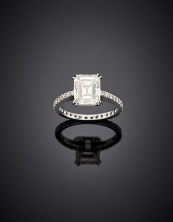 Anello in platino con diamante ottagonale a gradini di ct. 2,83 circa e diamanti rotondi sul gambo per complessivi ct. 3,10 circa, g 4,27 circa misura 11,5/51,5. Firmato e marcato Sabbadini, 983 MI. Con scatola