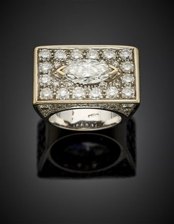 Lotto 20 Anello in oro bianco con diamanti a pavè a contornare un diamante a marquise di ct. 1,85 circa, per complessivi ct. 4,85 circa, g 12,16 circa misura 12/52.
