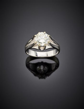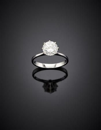 Lotto 21 Anello in oro bianco con diamante rotondo solitario di ct. 1,30 circa, g 2,02 circa misura 10/50. In scatola