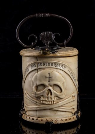 di forma cilindrica con coperchio, in avorio di elefante (Loxodonta africana Blumenbach, 1797 o Elephas maximus Linnaeus, 1758) scolpito sul fronte con il simbolo del teschio e tibie incrociate e con l'iscrizione "Confraternitas Misericordiae Mortis Bonae" (Misericordia è il nome di numerose confraternite e arciconfraternite di origine cattolica dedite all'assistenza dei "bisognosi". Diffuse in tutta Europa e nel Mondo, in Italia se ne rintracciano le fonti documentali più antiche con la fondazione nel 1244 della Misericordia di Firenze). Sul retro è presente il Cristogramma "IHS" sormontato dalla Croce, posizionati tra l'alfa (Α o α) e l'omega (Ω o ω), prima e l'ultima lettera dell'alfabeto greco, spesso usate nell’arte cristiana come simbolo in combinazione con la croce, in opposizione all’arianesimo. Queste lettere furono usate nell’Apocalisse (21:6-8) come simbolo dell’eterna essenza del Cristo; in altre parole, Dio è "l'inizio e la fine". Tutto ha origine in Lui e tutto finisce in Lui. Altezza 14 cm, altezza con manico 21,5 cm, base 13 x 12 cm. Peso 985 gr. Stato di conservazione: **** buono (difetti). Accompagnato da certificato di autenticità Ce.S.Ar. Centro Studi Archeometrici (pre-1947).