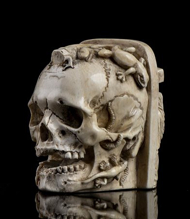 "Memento Mori" Vanitas rappresentata da un teschio in avorio di elefante (Loxodonta africana Blumenbach, 1797 o Elephas maximus Linnaeus, 1758) scolpito a tutto tondo, con rane, salamandre e vermi; nella parte posteriore la crocifissione di Cristo con Dio Padre, San Giuseppe e la Vergine.