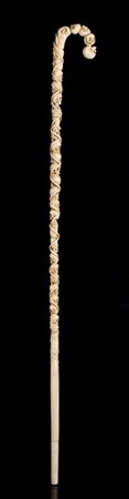 in avorio di elefante (Loxodonta africana Blumenbach, 1797 o Elephas maximus Linnaeus, 1758) scolpito ad'altorilievo sull’impugnatura e sulla canna da teschi contrapposti; sul fronte dell’impugnatura un mascherone. Il teschio è stato il simbolo della morte dal 1500 in poi; precedentemente la morte era rappresentata come uno scheletro. I teschi erano molto popolari nel periodo barocco, non solo come parte essenziale di ogni Camera delle Meraviglie (Wunderkammer), ma fungevano anche da ricordi contemplativi della mortalità. Altezza 79 cm, larghezza 7,5 cm. Peso 311 gr. Stato di conservazione: **** buono. Accompagnato da certificato di autenticità Ce.S.Ar. Centro Studi Archeometrici (pre-1947).