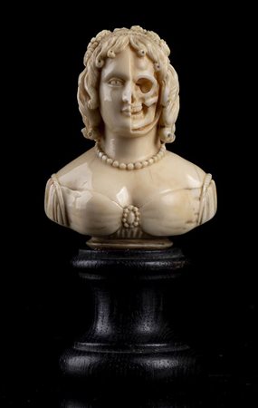 "Memento Mori" Vanitas rappresentata da un busto femminile in avorio di elefante (Loxodonta africana Blumenbach, 1797 o Elephas maximus Linnaeus, 1758) scolpito a tutto tondo, con la metà del volto a forma di teschio. Una vanitas è un'opera d'arte simbolica che mostra la caducità della vita, l'inutilità del piacere e la certezza della morte. Il teschio è stato il simbolo della morte dal 1500 in poi; precedentemente la morte era rappresentata come uno scheletro. I teschi erano molto popolari nel periodo barocco, non solo come parte essenziale di ogni Camera delle Meraviglie (Wunderkammer), ma fungevano anche da ricordi contemplativi della mortalità. Altezza x larghezza 6,5 x 5,1 cm (scultura); altezza x diametro 4 x 4 cm (base); altezza totale 10,5 cm. Peso totale 101,7 gr. Stato di conservazione: **** buono. Accompagnato da certificato di autenticità Ce.S.Ar. Centro Studi Archeometrici (pre-1947).