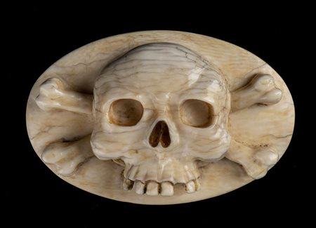 "Memento Mori" Vanitas rappresentata da una placca ovale in avorio di elefante (Loxodonta africana Blumenbach, 1797 o Elephas maximus Linnaeus, 1758) scolpita con il simbolo del teschio e tibie incrociate. Una vanitas è un'opera d'arte simbolica che mostra la caducità della vita, l'inutilità del piacere e la certezza della morte. Il teschio è stato il simbolo della morte dal 1500 in poi; precedentemente la morte era rappresentata come uno scheletro. I teschi erano molto popolari nel periodo barocco, non solo come parte essenziale di ogni Camera delle Meraviglie (Wunderkammer), ma fungevano anche da ricordi contemplativi della mortalità. Altezza x larghezza 8,5 x 5,6 cm. Peso 74,5 gr. Stato di conservazione: **** buono. Accompagnato da certificato di autenticità Ce.S.Ar. Centro Studi Archeometrici (pre-1947).