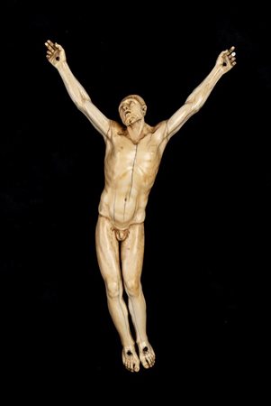 “Corpus Christi” in avorio di elefante scolpito (Loxodonta africana Blumenbach, 1797 o Elephas maximus Linnaeus, 1758), rappresentato senza perizoma e quasi calvo. Altezza x larghezza 30 x 17 cm. Peso 354 gr. Stato di conservazione: **** buono. Accompagnato da certificato di autenticità Ce.S.Ar. Centro Studi Archeometrici (pre-1947).