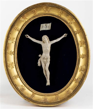 “Corpus Christi” in avorio di elefante scolpito (Loxodonta africana Blumenbach, 1797 o Elephas maximus Linnaeus, 1758). Cornice in legno dorato coeva. Dimensioni scultura 22 x 16 cm, dimensioni cornice 52 x 43,5 cm. Stato di conservazione: **** buono. Accompagnato da certificato di autenticità Ce.S.Ar. Centro Studi Archeometrici (pre-1947).