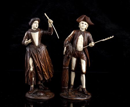 in legno e avorio di elefante (Loxodonta africana Blumenbach, 1797 o Elephas maximus Linnaeus, 1758) raffiguranti una figura femminile ed una maschile. Intagliate a tutto tondo, le figure con abiti a brandelli e scarpe di legno intagliato poggiano su una base di legno integrale e si rifanno direttamente alla tradizione di Simon Troger (1683-1768) nella rappresentazione di soggetti in legno e avorio con abiti a brandelli. Questo lotto è simile nello stile e nella tecnica ad altre sculture presenti nella collezione del Tyrolean Landesmuseum in Innsbruck, Austria (Rif Scott Defrin, Recognizing the Hand of Simon Troger - Tiroler Landesmuseum Ferdinandeum, Innsbruck). Lei: altezza x larghezza x profondità 21,5 x 8 x 8,6 cm; peso 253 gr. Lui: altezza x larghezza x profondità 22,5 x 8,9 x 8 cm; peso 211 gr. Stato di conservazione: **** buono. Accompagnato da certificato di autenticità Ce.S.Ar. Centro Studi Archeometrici (pre-1947).