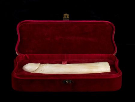 in avorio di elefante (Loxodonta africana Blumenbach, 1797 o Elephas maximus Linnaeus, 1758) scolpita a raffigurare un fallo. Sul fronte l’iscrizione “True love”. Custodia in velluto.