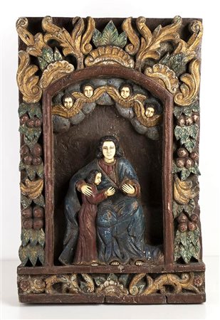 in legno dipinto e dorato, raffigurante Madonna con bambino sormontata da quattro putti alati, con volti, mani e piedi in avorio di elefante scolpito (Loxodonta africana Blumenbach, 1797 o Elephas maximus Linnaeus, 1758). Altezza x larghezza x profondità 72 x 46,7 x 9 cm. Stato di conservazione: **** buono (restauri pregressi). Accompagnato da certificato di autenticità Ce.S.Ar. Centro Studi Archeometrici (pre-1947).