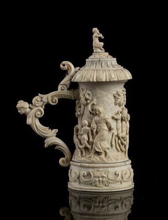 in avorio di elefante (Loxodonta africana Blumenbach, 1797 o Elephas maximus Linnaeus, 1758) scolpito ad altorilievo a scene classiche, manico ad erma femminile tra volute, coperchio incernierato e decorato a baccellature e sormontato da figura a tutto tondo. Altezza x larghezza x profondità 12 x 5,2 x 4,2 cm. Peso 78 gr. Stato di conservazione: **** buono. Accompagnato da certificato di autenticità Ce.S.Ar. Centro Studi Archeometrici (pre-1947).