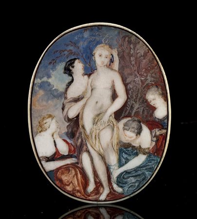 in avorio di elefante, di forma ovale (Loxodonta africana Blumenbach, 1797 o Elephas maximus Linnaeus, 1758), dipinta sul fronte con la raffigurazione di "Diana e le sue ninfe al bagno”. La parte posteriore, leggermente bombata è decorata con volute floreali e fogliate piqué clouté e piqué posé in tartaruga, con cabochon in corallo mediterraneo.