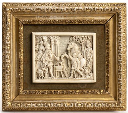 in avorio di elefante (Loxodonta africana Blumenbach, 1797 o Elephas maximus Linnaeus, 1758) scolpita ad alto rilievo, raffigurante un capriccio architettonico con personaggi. Cornice lignea dorata coeva. Altezza x larghezza x profondità 11,4 x 9 x 0,8 cm. Cornice 19,2 x 22,1 cm. Stato di conservazione: **** buono. Accompagnato da certificato di autenticità Ce.S.Ar. Centro Studi Archeometrici (pre-1947).
