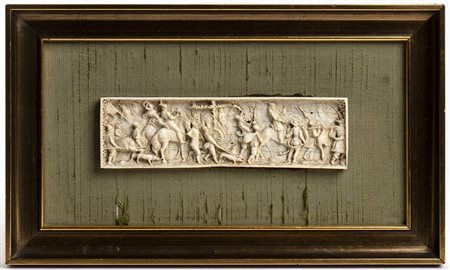 in avorio di elefante (Loxodonta africana Blumenbach, 1797 o Elephas maximus Linnaeus, 1758) scolpita ad alto rilievo, raffigurante il ritorno dalla caccia. Altezza x larghezza x profondità 18,7 x 5,4 x 0,8 cm. Stato di conservazione: **** buono.