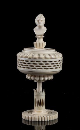 in avorio di elefante scolpito (Loxodonta africana Blumenbach, 1797 o Elephas maximus Linnaeus, 1758) con coperchio decorato a baccellature e sormontato da figura a tutto tondo; all’interno del coperchio una riserva bordata in oro scolpita con strumenti musicali. Altezza x larghezza x profondità 18 x 10 x 10 cm. Peso 264 gr. Stato di conservazione: ***** eccellente. Accompagnato da certificato di autenticità Ce.S.Ar. Centro Studi Archeometrici (pre-1947).