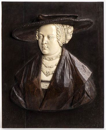 in avorio di elefante (Loxodonta africana Blumenbach, 1797 o Elephas maximus Linnaeus, 1758) e legno raffigurante un ritratto di donna, alla maniera di Hans Holbein. Altezza x larghezza 37,2 x 30,2 cm. Stato di conservazione: **** buono. Accompagnato da certificato di autenticità Ce.S.Ar. Centro Studi Archeometrici (pre-1947).