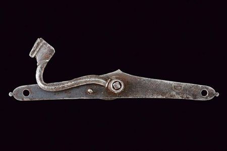 Lotto 2 Batteria a miccia, datazione: Prima metà del XVII Secolo provenienza: Italia, Cartella piatta a bordi inclinati e cuspidati, le due estremità con piccolo lobo. Scodellino con parascintille e copriscodellino girevole privo di manopola. Serpentina incurvata (una ganascia distaccata). Il retro con molle. lunghezza plate 20 cm.