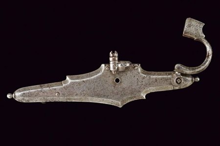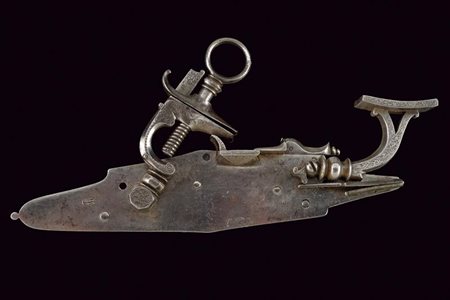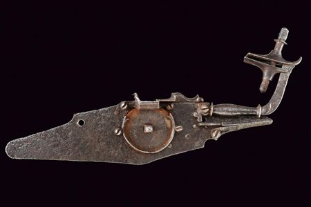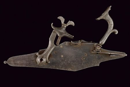 Lotto 4 Batteria a ruota da schioppetto, datazione: Prima metà del XVII Secolo provenienza: Brescia, Con cartella piatta a bordi cuspidati, la ruota tenuta da una sottile ghiera a estremità biforcute. Scodellino con copriscodellino scorrevole. Intaccature. Il cane con la prima metà del collo a balaustro, la seconda quadra e incurvata. lunghezza plate 23 cm.
