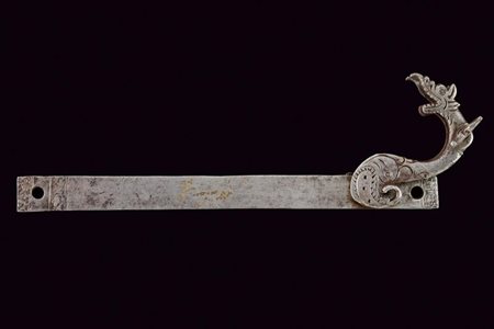 Lotto 3 Rara batteria a miccia, datazione: 1580 circa provenienza: Italia, Cartella piatta di forma rettangolare, munita di due sforature per il montaggio e con le estremità recanti cornicette con incisioni a racemi. Bellissima serpentina lavorata a drago, con collo di forma controcurvata, la base ingrossata e incisa a raffigurare il corpo dell'animale, con un'appendice a riccio per la coda; l'estremità superiore biforcuta, completa della sua chiave per stringere le ganasce e con morsetto intagliato e sagomato a effigiare la testa del mostro. Il retro completo di molle. Vedi un'esemplare assai somigliante di questa affascinante tipologia in 'Repertorio Storico degli Archibugiari Italiani', anche questo con serpentina lavorata a drago, datato attorno al 1580, pag. 14 fig. 4. lunghezza plate 17,6 cm.