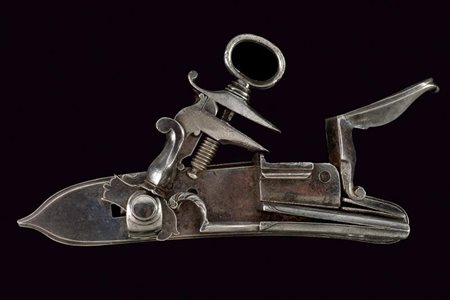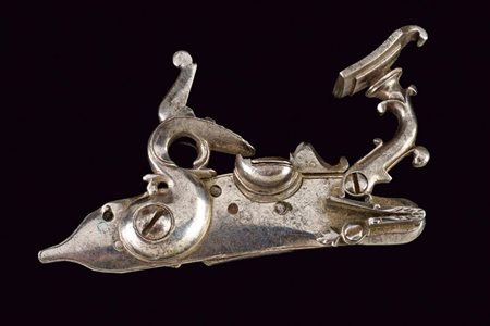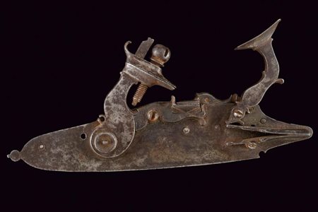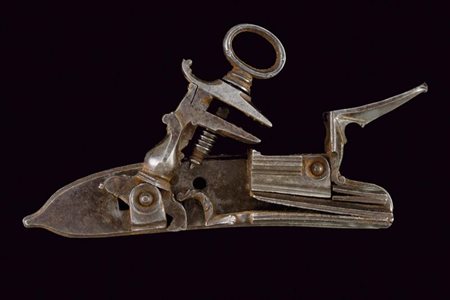 Lotto 8 Batteria a pietra alla fiorentina, datazione: terzo quarto del XVII Sec. provenienza: Italia Centro-settentrionale, Cartella piatta cuspidata solo sul lato anteriore e con codetta munita di bottoncino a lobo. Cane leggermente controcurvato. L'arresto del cane esterno montato sotto allo scodellino. lunghezza plate 21,5 cm.