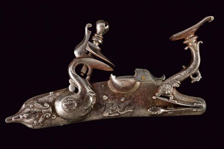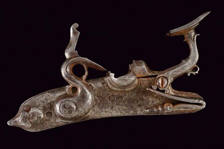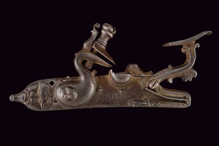 Lotto 16 Notevole batteria a pietra alla fiorentina firmata G.B. Petardino, datazione: secondo quarto del XVII Sec. provenienza: Brescia, Cartella piatta a bordi obliqui. La codetta con bell'intaglio a testa di mostro lavorata in rilievo. La superficie con resti di incisioni a racemi e fiori, al centro forse tracce di alcune lettere non più leggibili. Il collo del cane scolpito a protome grottesca con tratti muliebri. Le ganasce con intagli a foglie e incisioni a fiori. Anche la vite del morsetto scolpita con figura antropomorfa. L'arresto del cane tutto lavorato a effigiare un drago. Lo scodellino con foglie in rilievo. Il collo della martellina lavorato en suite con il cane. Il retro con alcune incisioni e la firma. 'G B PETARDINO'. Per esemplari simili per foggia e decorazioni, ma meno elaborati, vedi 'Armi da Fuoco Italiane' di Gaibi, nn. 298- 303, tutti di origine bresciana. lunghezza plate 19,2 cm.