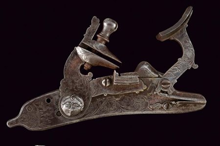 Lotto 24 Batteria a pietra alla romana con mascherone firmata Ubaldo Matassa, datazione: XVIII Secolo provenienza: Italia centrale, Cartella piatta con bordi scantonati, alla codetta bel mascherone in rilievo a volto barbuto e ornato a puntini. Cane a balaustro con coprivite a mascherone e ganasce incise a foglie. Il centro della piastra con racemi. Un altro mascherone al dorso della martellina. Intaccature. Il bordo inferiore recante la firma 'UBALDO MATASSA ... A... ' (il seguito purtroppo non leggibile). Lo stile di questa interessante batteria è tipico di Celalba. E' nota la firma di Ubaldo Matassi (prima metà del XVIII secolo), dell'omonima stirpe di armaioli anghiaresi, che aveva stretti legami con Celalba, vedi 'Repertorio Storico degli Archibugiari Italiani', pag. 358. Vedi la foto di un mascherone molto somigliante in 'Gli Armaioli Anghiaresi' di N. di Carpegna, pag. 112.Un pezzo che merita sicuramente uno studio approfondito. lunghezza plate 14,5 cm.