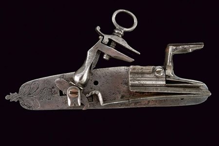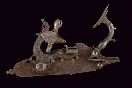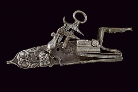 Lotto 15 Rara batteria a pietra alla fiorentina, datazione: primo quarto del XVII Sec. provenienza: Italia del Nord, Cartella piatta con bordi cuspidati. La codetta con bottoncino, Il cane con base di forma ottagonale, fissata dall'interno e recante rosetta incisa, la base del collo con nodo e anellature, poi di forma incurvata e con incisioni a racemi. Lo scodellino inciso en suite sul lato inferiore, il copriscodellino sempre con racemi. La martellina con base a nodi e anellature, poi con collo curvo di sezione quadra e biforcuto, ache questa con fini incisioni a racemi. Il retro con alcuni elementi della meccanica incisi, forse tracce di un timbro a corona. lunghezza plate 21,2 cm.