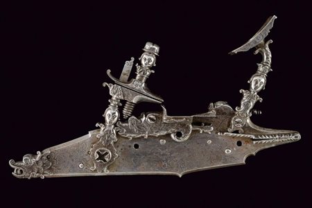 Lotto 7 Batteria a pietra alla fiorentina, datazione: Seconda metà del XVII Secolo provenienza: Italia Centro-settentrionale, Cartella piatta con codetta lobata, di forma lievemente incurvata. Cane con collo recante ricci intagliati. Arresto esterno montato sotto allo scodellino. Martellina intagliata en suite. Da pulire. Per pistola. lunghezza plate 14,4 cm.