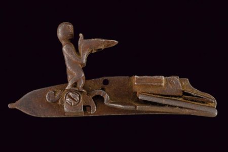 Lotto 17 Batteria a pietra alla romana, datazione: XVIII Secolo provenienza: Marche, Cartella piatta con resti di incisioni. Il collo del cane lavorato a tuttotondo a effigiare un personaggio intento a sorreggere la ganascia inferiore (quella superiore e il morsetto mancanti). Scodellino con decori modanati, il mollone con intagli. Martellina mancante. In patina antica. Tipico stile marchigiano. lunghezza plate 14,6 cm.