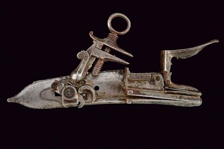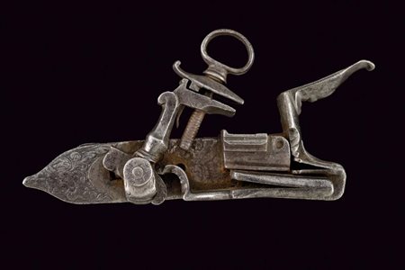 Lotto 5 Piccola batteria a pietra alla fiorentina, datazione: XVIII Secolo provenienza: Area Tosco-Emiliana, Cartella lievemente tondeggiante con margine a lista ribassata. Cane con vite del morsetto e ganascia superiore mancanti. Martellina con collo intagliato a ricci. Piccole incisioni a foglie sul lato anteriore e su parte della meccanica interna. lunghezza plate 8,7 cm.