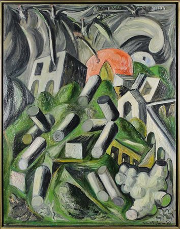 Lotto 17 CESARE BERLINGERI, " Invasione sul rosso e grigio", 1989, Olio su tela, Dim. 35x40, Opera accompagnata da autentica dell'Artista su foto e pubblicata, Al verso: timbro "Galleria Perlini Arte" Reggio Calabria, data, titolo e firma