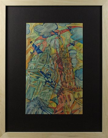 Lotto 24 UMBERTO BONETTI, "In volo su Messina", Anni '30 ca., Tecnica mista su carta, Dim. 30x20, Opera Archiviata Presso Archivio "Umberto Bonetti" con N° 708B da Adriana Bonetti, Al fronte: firmato in basso a destra, Opera con cornice