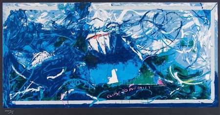 Lotto 3 Mario Schifano (Homs 1934 - Roma 1998), “Cruise to Infinity”. Serigrafia materica a smalti, firmata in basso a destra Schifano, esemplare in basso a sinistra XXXIV/L, reca timbro a secco Sigart, Lastra H cm 45x89.5 - Foglio H cm 70x100 (lievi usure)