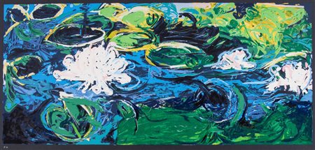 Lotto 4 Mario Schifano (Homs 1934 - Roma 1998), “Gigli d’acqua”. Serigrafia materica a smalti, firmata in basso a destra Schifano, esemplare in basso a sinistra P.A., reca timbro a secco Sigart, Lastra H cm 42.5x89 - Foglio H cm 70x100 (lievi usure - difetti)