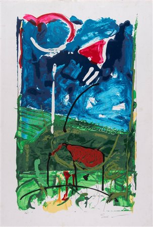 Lotto 6 Mario Schifano (Homs 1934 - Roma 1998), “Dinosauro”. Serigrafia materica a smalti, firmata in basso a destra Schifano, numero di tiratura in basso a sinistra 148/150, reca timbro a secco Grafiser Stamperia d'Arte - Roma, H cm 100x70 (lievi usure)