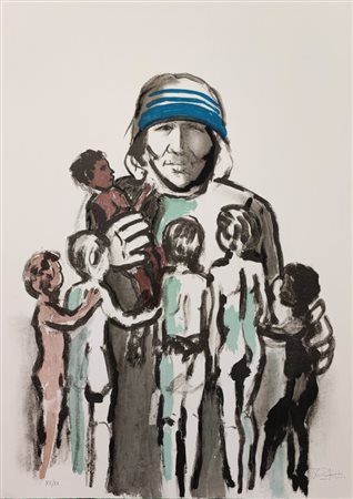Ibrahim Kodra - Madre Teresa di Calcutta, litografia 50x70 cm; firma in basso a destra, tiratura XII/XX in basso a sinistra.