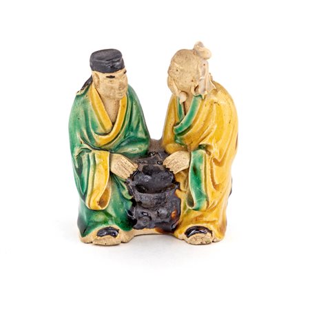Lotto 4 Piccolo gruppo in terracotta invetriata, Cina, XX secolo raffigurante due giocatori di dadi, cm 7,5x6x4