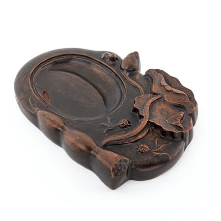 Lotto 5 Sciacqua pennelli in terracotta brunita, Cina di forma sagomata caratterizzato da vegetazione palustre ed insetti resi in bassorilievo. Marca incussa al verso. Piccola rottura al bordo, cm 3x23x15,5