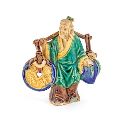 Lotto 6 Figura in terracotta invetriata, Cina, XX secolo raffigurante un viandante con moneta e zucca quali simboli di felicità e benessere, cm 10x9x4 ca