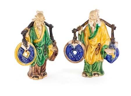 Lotto 7 Due figure in terracotta invetriata, Cina, XX secolo raffiguranti viandanti con simboli portafortuna appesi al bastone di bambù posto sulle spalle, cm 15x12x6 ca