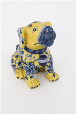 Lotto 8 Cane pechinese in porcellana, XX secolo decorato a fiori blu su fondo giallo, cm 20x13,5x22