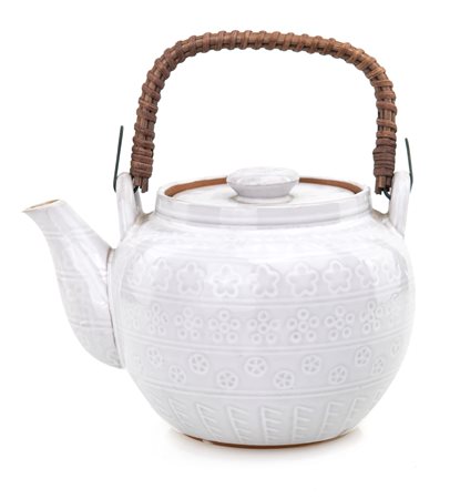 Lotto 9 Teiera in terracotta smaltata bianca, Giappone decorata da corolle minime sparse sottovernice; manico ad anello rivestito in midollino, altezza cm 23