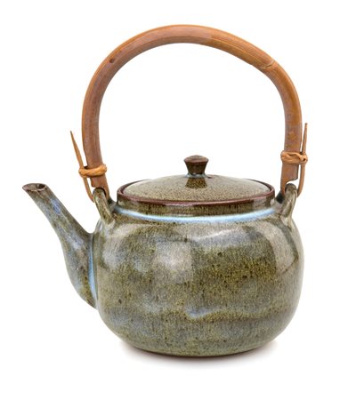 Lotto 12 Teiera in gres smaltato verde/celeste, Giappone di forma sferica con manico ad arco costituito da una porzione di canna , altezza cm 25