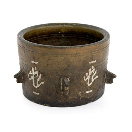 Lotto 13 Mortaio in bronzo, arte asiatica, fine del XIX secolo di forma cilindrica decorato da sporgenze geometriche e ideogrammi, cm 9,5x14