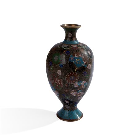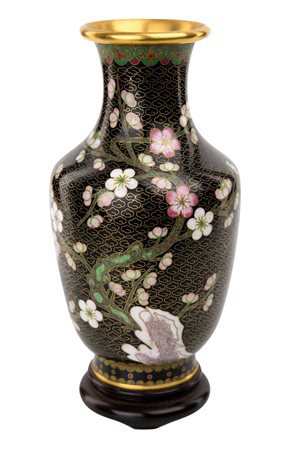 Lotto 16 Vaso in metallo cloisonné, Cina decorato da un ciliegio in fiore su fondo nero; completo di basetta in legno, altezza cm 20