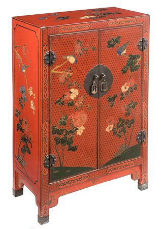 Lotto 15 Mobile in legno laccato rosso, Cina decorato sulla facciata e sui fianchi da lunghi tralci fioriti animai da figure di volatile; due ante frontali con serratura in bronzo, piedi a mensola, cm 92x61x31