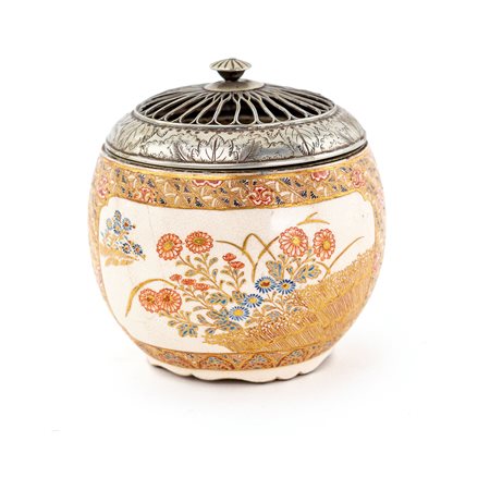 Lotto 17 Coppetta in ceramica, Giappone di forma sferica con fitta e minuta decorazione in rosso e oro con tracce di azzurro, caratterizzata da due composizioni floreali entro riserve; basso piede ad anello con profilo inferiore ondulato e coperchio traforato in metallo argentato, cm 9x8