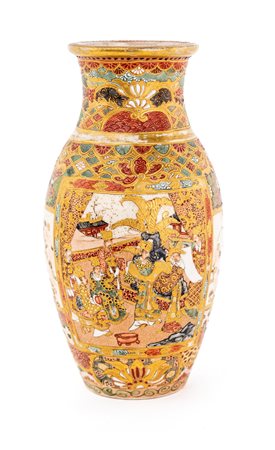 Lotto 19 Piccolo vaso a balaustro in ceramica, Kyoto Satsuma, Giappone con fitta e minuta decorazione in parte rilevata in oro sull'intera superficie su cui emergono due scene con figura di dignitario ed altri personaggi separati da composizioni fiorite su fondo crema, altezza cm 15