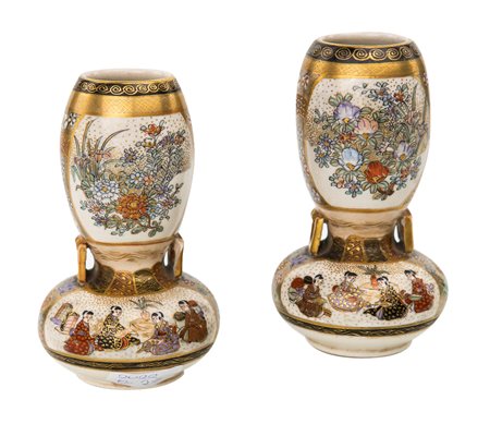 Lotto 20 Coppia di piccoli vasi in ceramica, Kyoto Satsuma, Giappone con parte superiore oblunga su sfera schiacciata, decorati da composizioni floreali e scene di genere su fondo crema e dorato , altezza cm 12