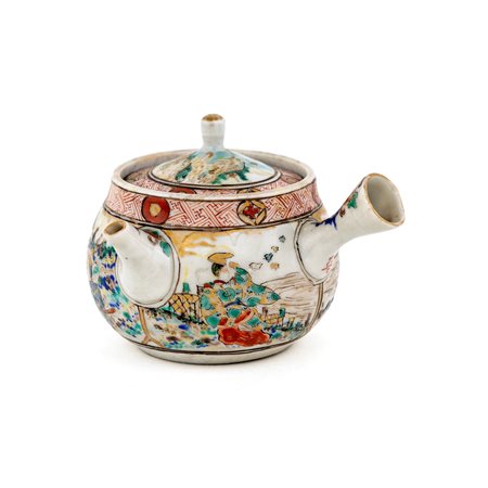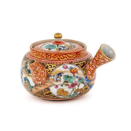 Lotto 21 Piccola teiera kyusu in porcellana, Giappone con decorazione policroma lumeggiata in oro a raffigurare scene di genere con figure e animali, cm 7