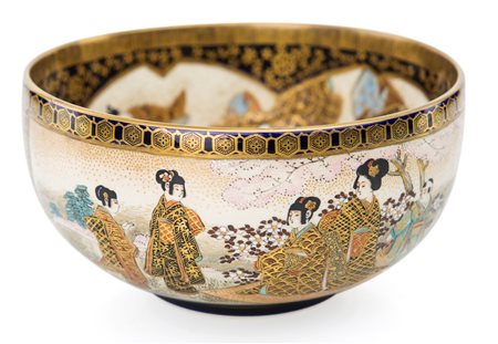Lotto 22 Bowl in ceramica di Satsuma, Giappone con ricca decorazione caratteristica della manifattura con figure femminili ambientate in un paesaggio fiorito, cm 8x15
